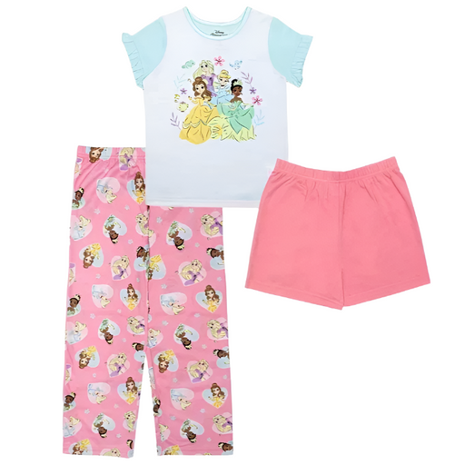 Only 1 left!The Disney Princess Big Girls Sleepwear Set includes a short-sleeve top, coordinating shorts, and pajama pants, all featuring assorted character-th...