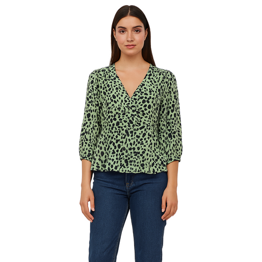 Only - Masumi 3/4 Wrap Top Medium Green/Black Spot